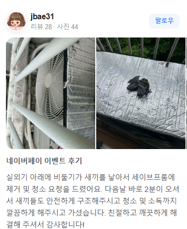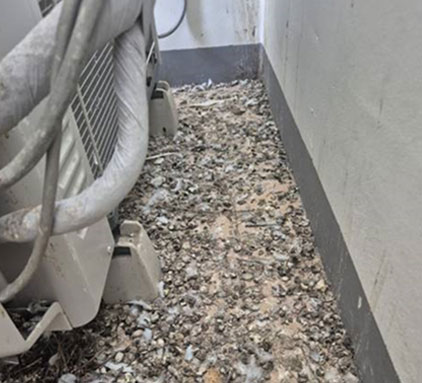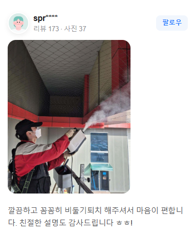 비둘기 분비물, 깃털, 오염물 등을 철저히 제거하여
